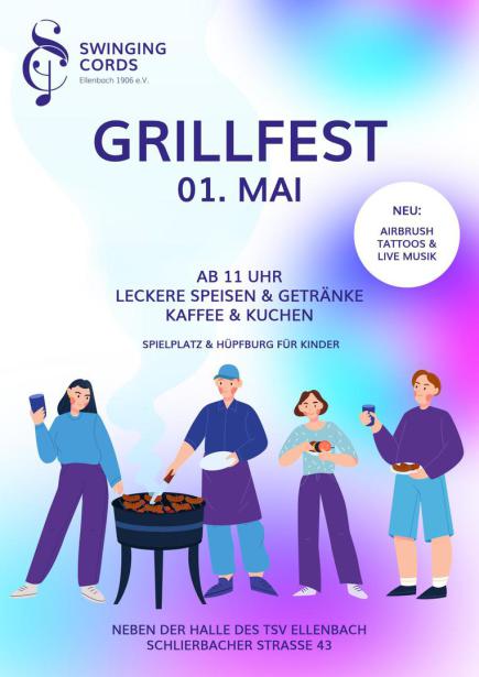 Das Grillfest der Swinging Cords findet am 01. Mai ab 11 Uhr hinter der Scheune neben der Halle des TSV Ellenbach (Schlierbacher Str. 43 64658 Fürth) statt.